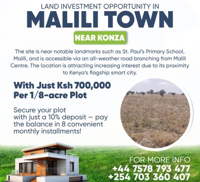 The site is near notable landmarks such as St. Paul’s Primary School, Malili, and is accessible via an all-weather road branching from Malili Centre. The location is attracting increasing interest due to its proximity to Kenya’s flagship smart city.
